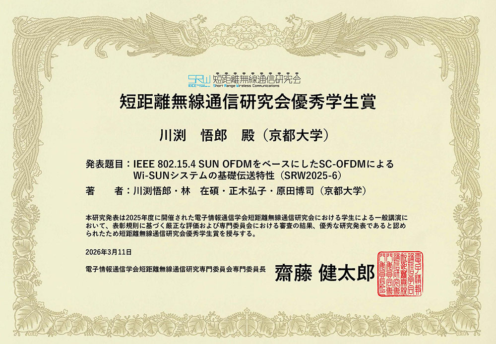 2025年3月7日の電子情報通信学会短距離無線通信研究会において2024年度表彰が承認され、当研究室のM1岡松 夢幸君とB4高橋 金平君が研究奨励賞、M2川渕 悟郎君が優秀学生賞、香田優介准教授が優秀ポスター賞を受賞しました。