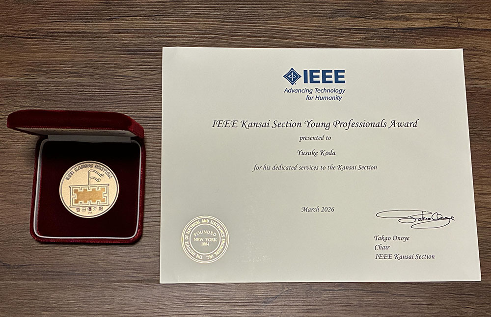 2026.03.23 香田准教授がIEEE 関西支部 Young Professionals 賞を受賞 3月23日に香田 優介准教授がIEEE 関西支部 Young Professionals 賞を受賞しました。 この賞はIEEE 関西支部に属する若手会員の中から、IEEE が発行する論文誌、IEEE 主催、共催または協賛する国際会議での技術的な発表や、研究・教育に関連したグループやプロジェクトにおけるリーダーシップを通じてIEEE関西支部に貢献した研究者を表彰するものです。 NEXT PREV
